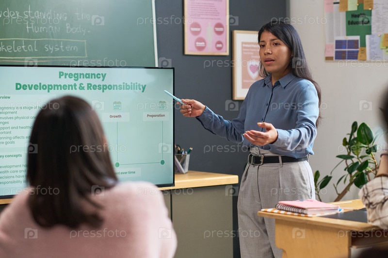 Молодая взрослая испаноязычная женщина учит развитию беременности девочкам-подросткам