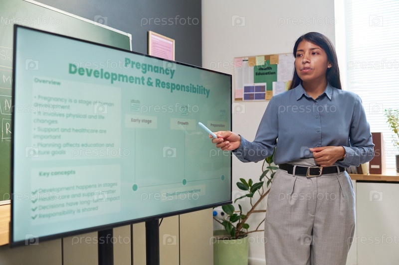 Молодая взрослая испаноязычная женщина преподает уроки беременности, развития и ответственности