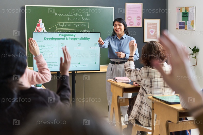 Молодая взрослая испаноязычная женщина преподает разным подросткам в классной обстановке