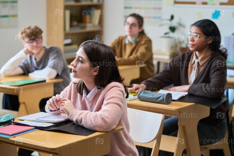 Многонациональная группа подростков, сидящих в классе и слушающих учителя