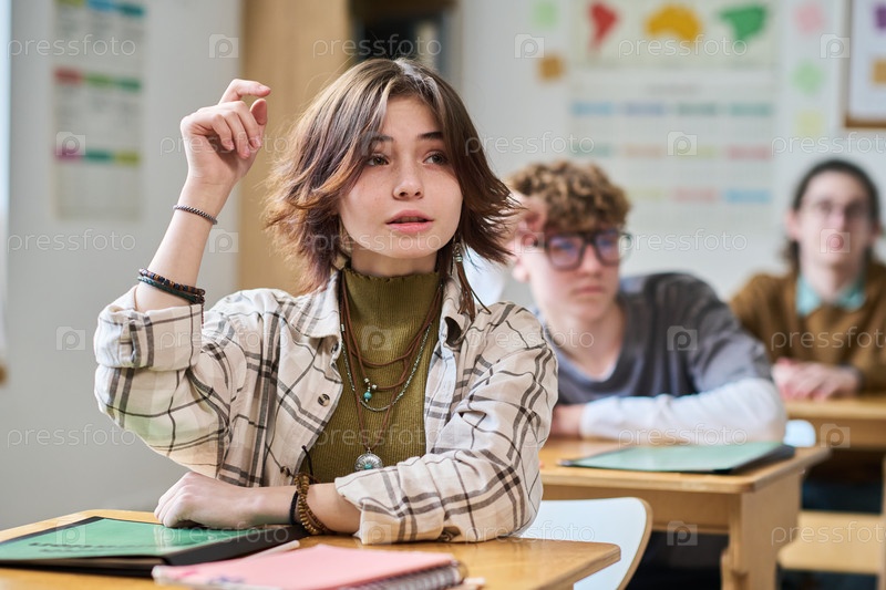 Подростковая белая девушка поднимает руку, посещая уроки в классе средней школы