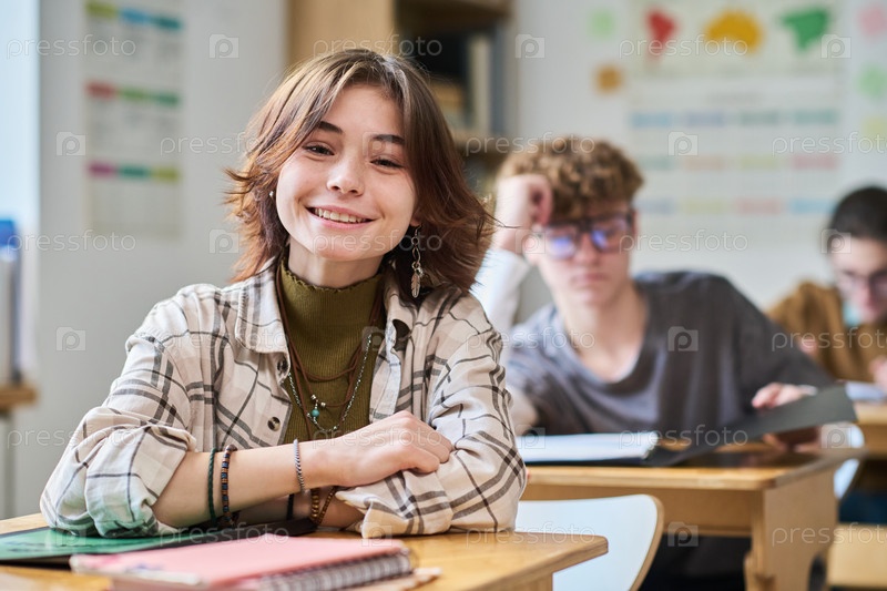 Портрет улыбающейся белокожей девочки-подростка, сидящей за столом в классе