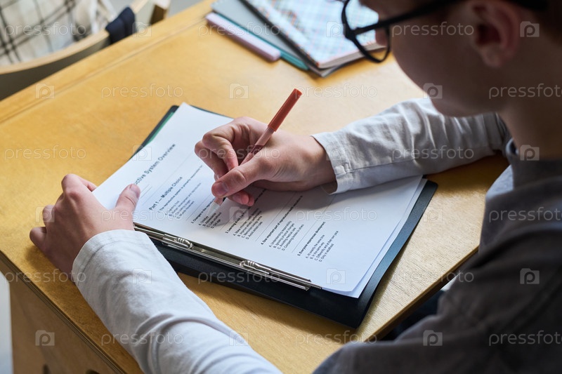 Кавказский мальчик-подросток пишет ответы на бумаге, изучая за рабочим столом