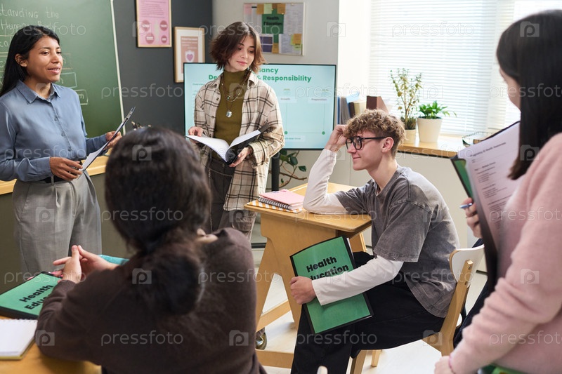 Группа разнообразных подростков, обсуждающих здравоохранение в классной обстановке