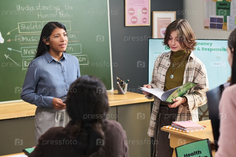 Молодая взрослая испаноязычная женщина ведет интерактивную научную деятельность в области здравоохранения с подростками