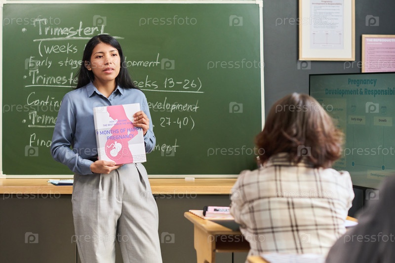 Молодая взрослая испаноязычная женщина преподает стадии беременности различным студентам