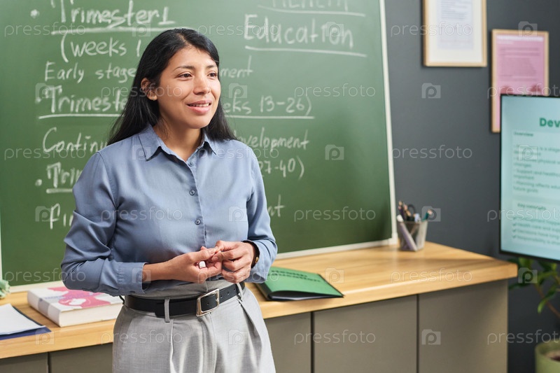 Молодая взрослая испаноязычная женщина преподает в классе во время образовательной презентации