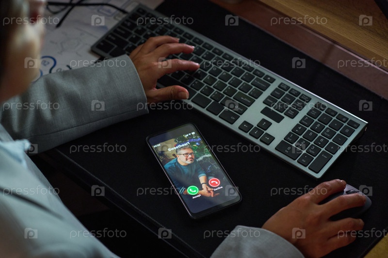 Молодая взрослая женщина получает видеозвонок со смартфона на рабочей станции