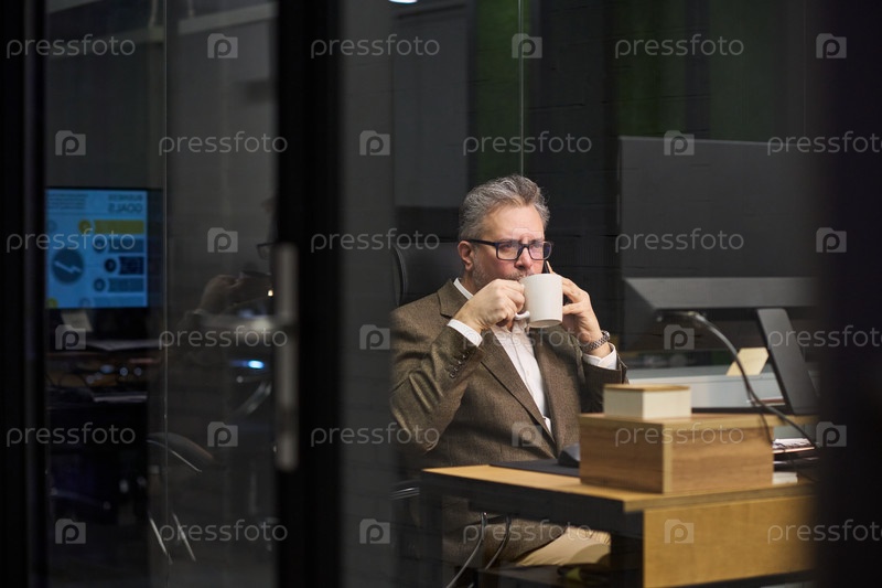 Мужчина средних лет пьет кофе, работая за рабочим столом