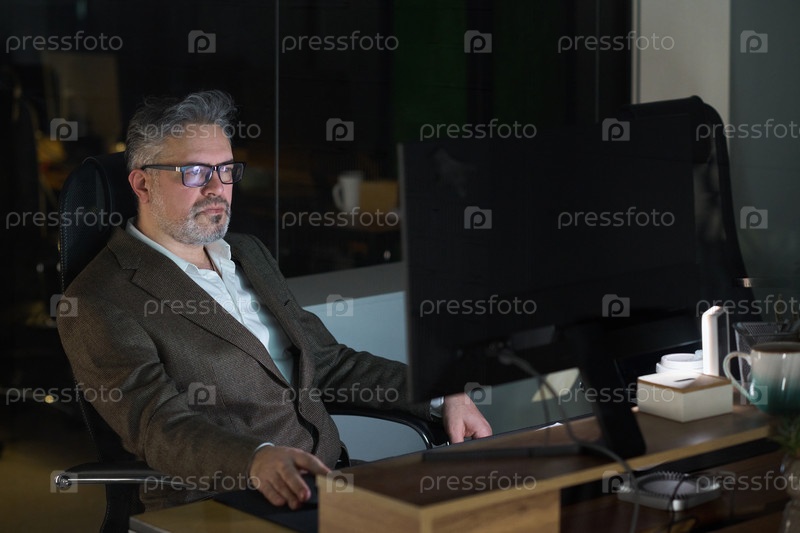 Мужчина средних лет фокусируется на мониторе компьютера во время ночной смены