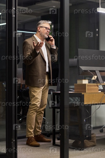 Мужчина средних лет разговаривает со смартфоном, стоя в офисе