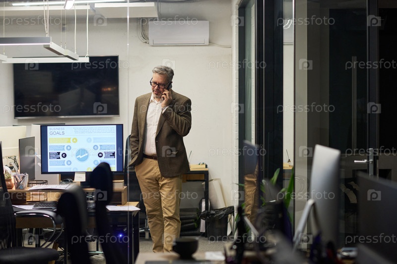 Мужчина средних лет разговаривает со смартфоном в современном офисе ночью