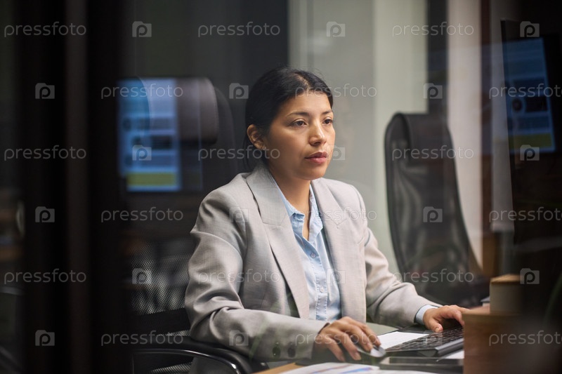 Молодая испаноязычная женщина работает на компьютере в современной офисной среде