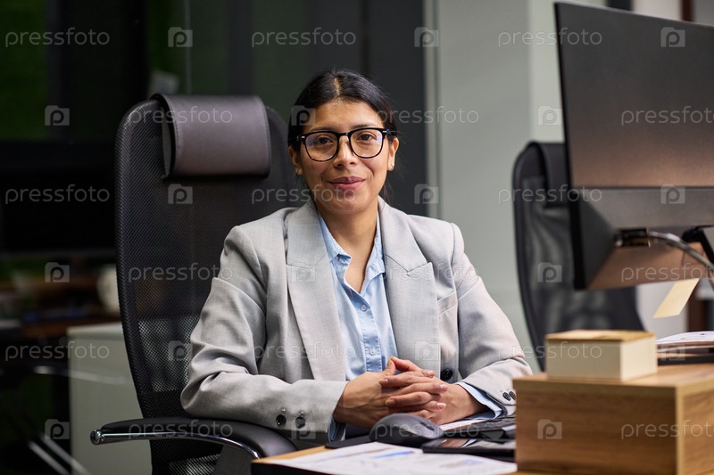 Портрет молодой испаноязычной женщины, улыбающейся, сидящей за рабочим столом