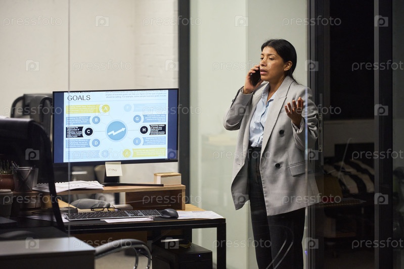 Латиноамериканка разговаривает со смартфоном, работая в офисе