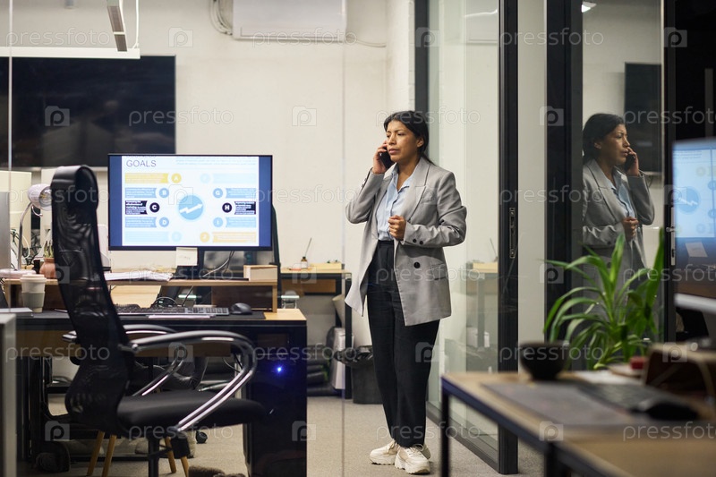 Молодая женщина разговаривает со смартфоном в современном офисном рабочем пространстве
