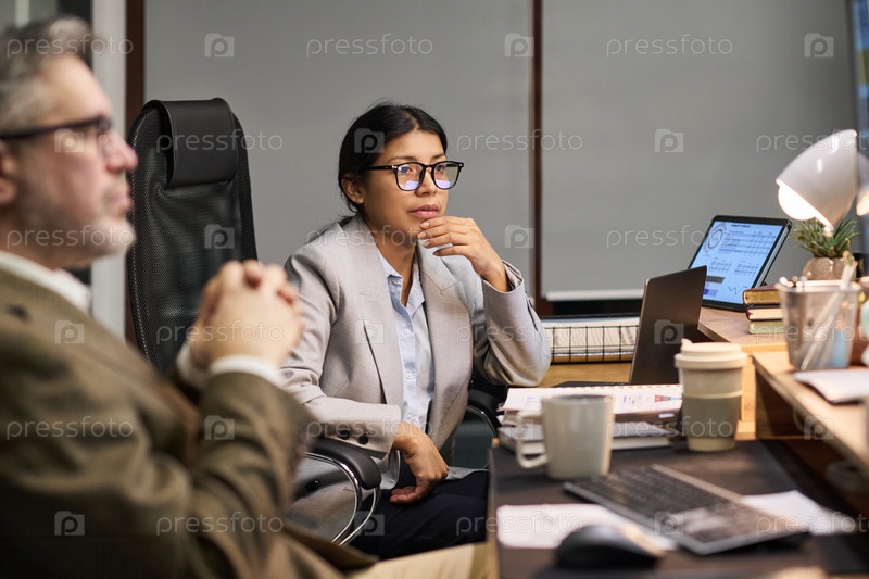 Молодая латиноамериканка анализирует данные с мужчиной среднего возраста