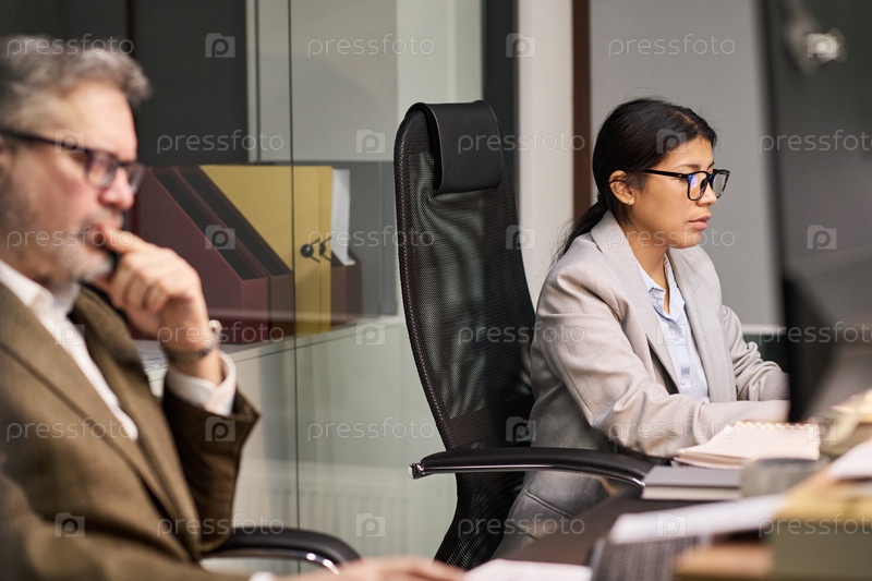 Молодая испаноязычная женщина работает за столом рядом с мужчиной среднего возраста в офисе