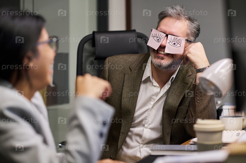 Мужчина среднего возраста в бумажных глазах шутит с коллегой по работе