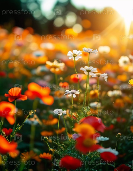 На лужайке много цветов под солнечными лучами. Цвета смешиваются с цветением цветов. Свет сияет сквозь листья, создавая яркие пятна на земле. Это весна Generative AI