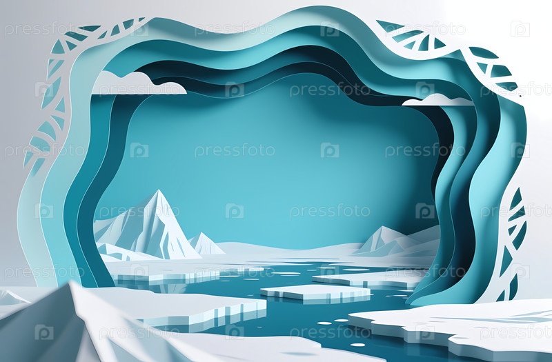 Ледники медленно движутся в Северном Ледовитом океане.Ледники и горные вершины поднимаются на заднем плане.Небо ясное и синее, отражающееся на поверхности воды Generative AI