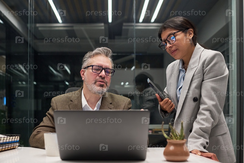 Мужчина среднего возраста и молодая взрослая испаноязычная женщина обсуждают проект