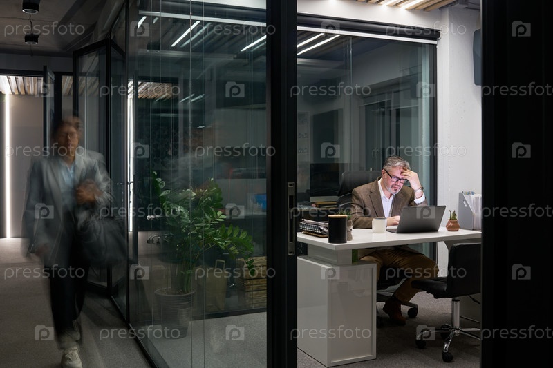 Мужчина средних лет работает до поздней ночи в современной офисной среде