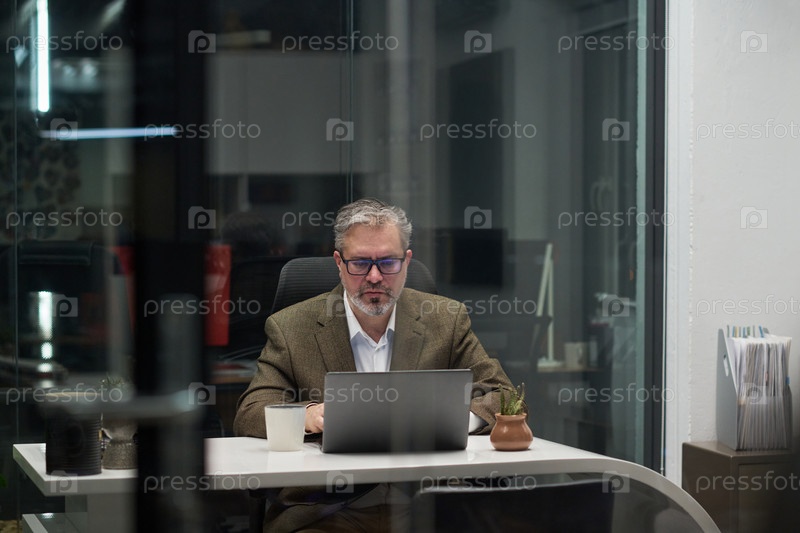 Мужчина средних лет, работающий на ноутбуке в современном офисе ночью
