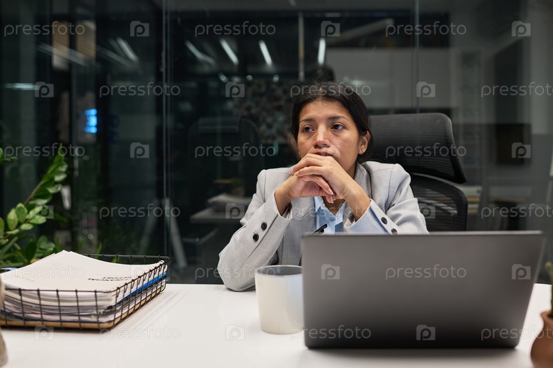 Испаноязычная женщина сидит за рабочим столом и выглядит вдумчивой в офисе