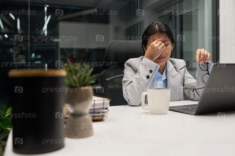 Молодая испаноязычная женщина, сидящая за рабочим столом и чувствующая стресс во время работы