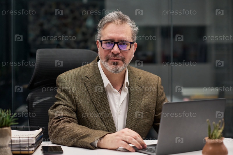 Портрет мужчины средних лет, работающего на ноутбуке в современном офисе