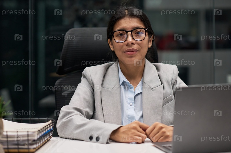 Портрет молодой испаноязычной женщины с очками, работающей в офисе