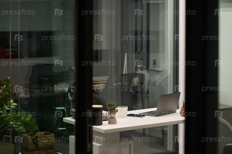 Современный офисный стол с ноутбуком и кофейной кружкой во время ночной работы