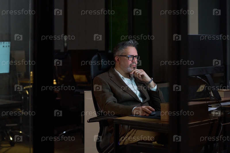 Мужчина средних лет, работающий до поздней ночи за компьютером в офисе