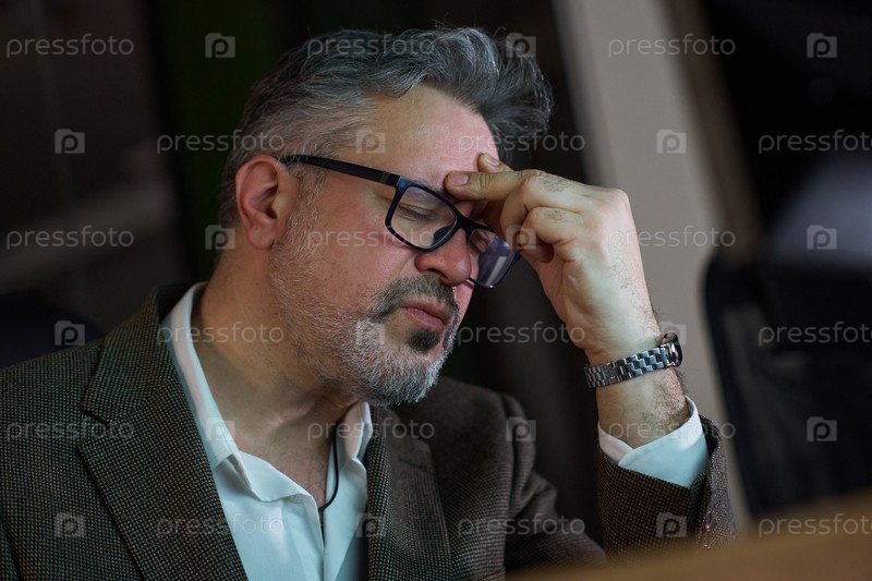 Мужчина среднего возраста, носящий очки Чувство стресса на рабочем месте