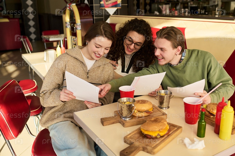 Группа молодых друзей, читающих меню и улыбающихся в ретро-динере