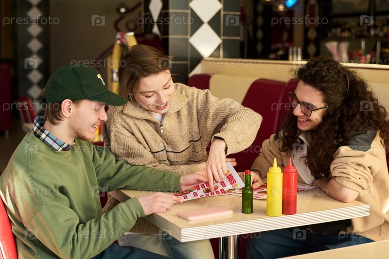 Группа молодых друзей, улыбающихся при выборе меню вместе