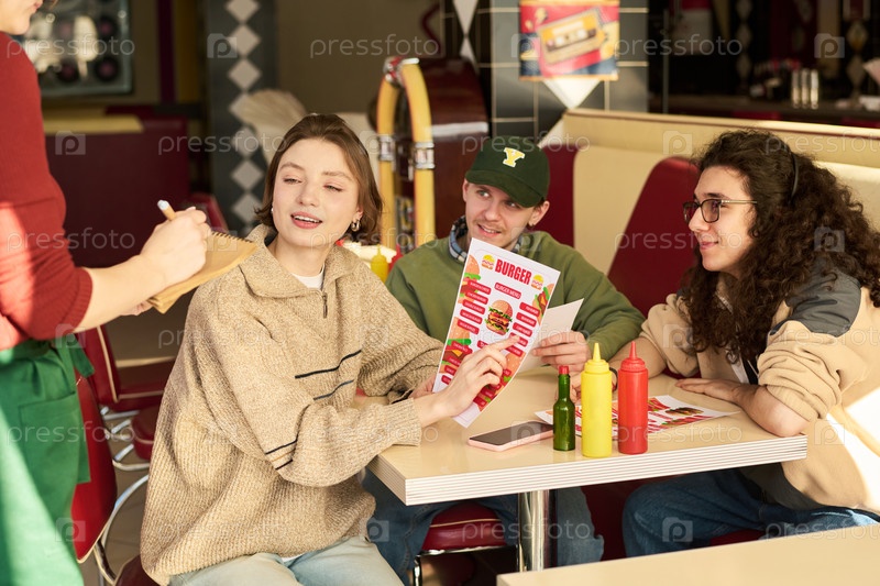 Группа студентов, заказывающих еду в столовой и улыбающихся вместе