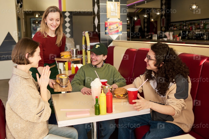 Группа молодых студентов, общающихся и едят фаст-фуд в ресторане