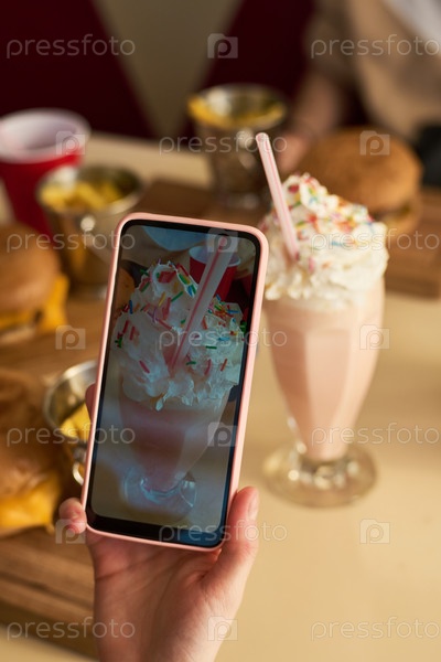 Неизвестная женщина фотографирует молочный коктейль со смартфоном в ресторане