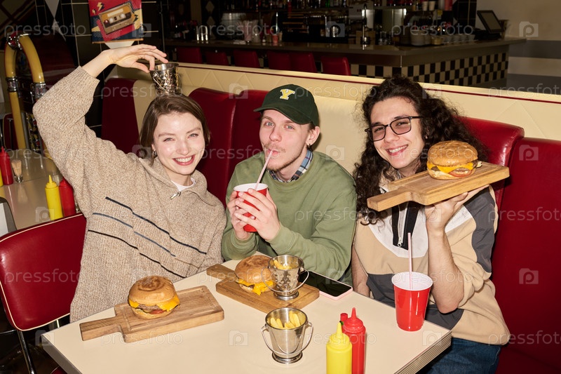 Группа друзей-молодых взрослых, наслаждающихся бургерами и напитками в Retro Diner