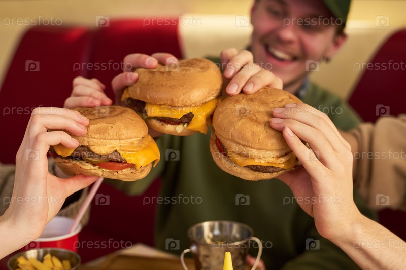 Группа студентов празднует дружбу, выпивая вместе чизбургеры
