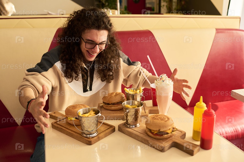 Молодой белый мужчина улыбается, ожидая съесть бургеры и картошку фри