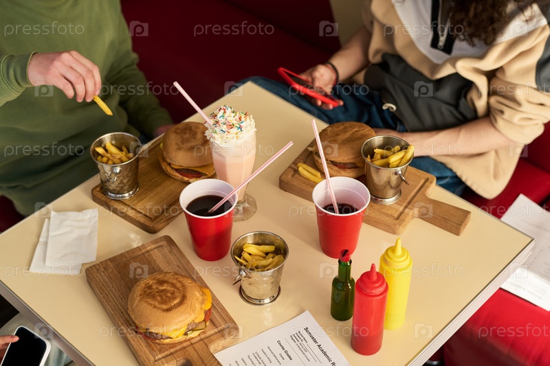 Два студента едят гамбургеры и картофель фри, используя смартфоны за столом в ресторане