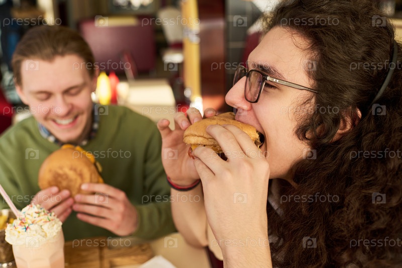 Два молодых человека наслаждаются едой гамбургеров вместе за столом в ресторане