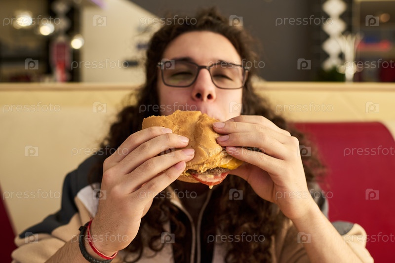Мужчина из поколения Z наслаждается едой гамбургеров в помещении