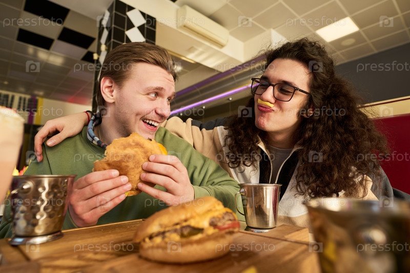 Молодые белые мужчины смеются вместе, едят гамбургеры за столом в ресторане