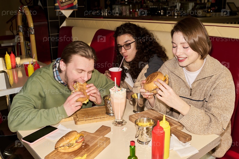 Трое студентов едят бургер с друзьями, наслаждаясь молочными коктейлями в помещении