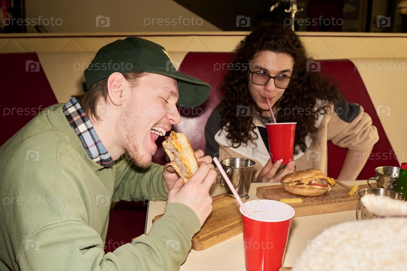 Молодой человек ест бутерброд, в то время как его друг пьет газировку