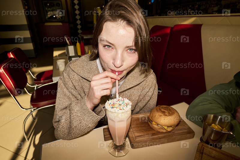 Портрет молодой женщины, пьющей молочный коктейль в ресторане